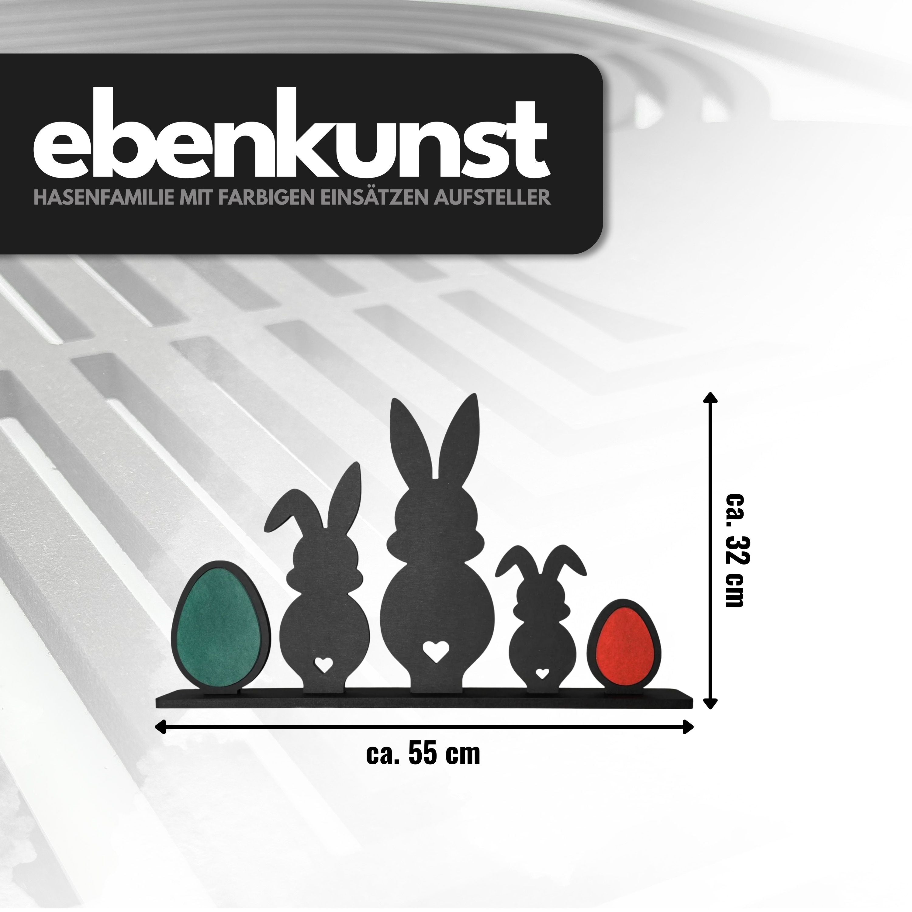Bringen Sie frühlingshafte Freude in Ihr Zuhause – mit unserem Aufsteller Hasenfamilie mit farbigen Einsätzen! Die niedliche Hasenfamilie mit drei liebevoll gestalteten Hasen und zwei Ostereiern mit farbigen Einsätzen verleiht Ihrer Osterdekoration eine besondere Note.