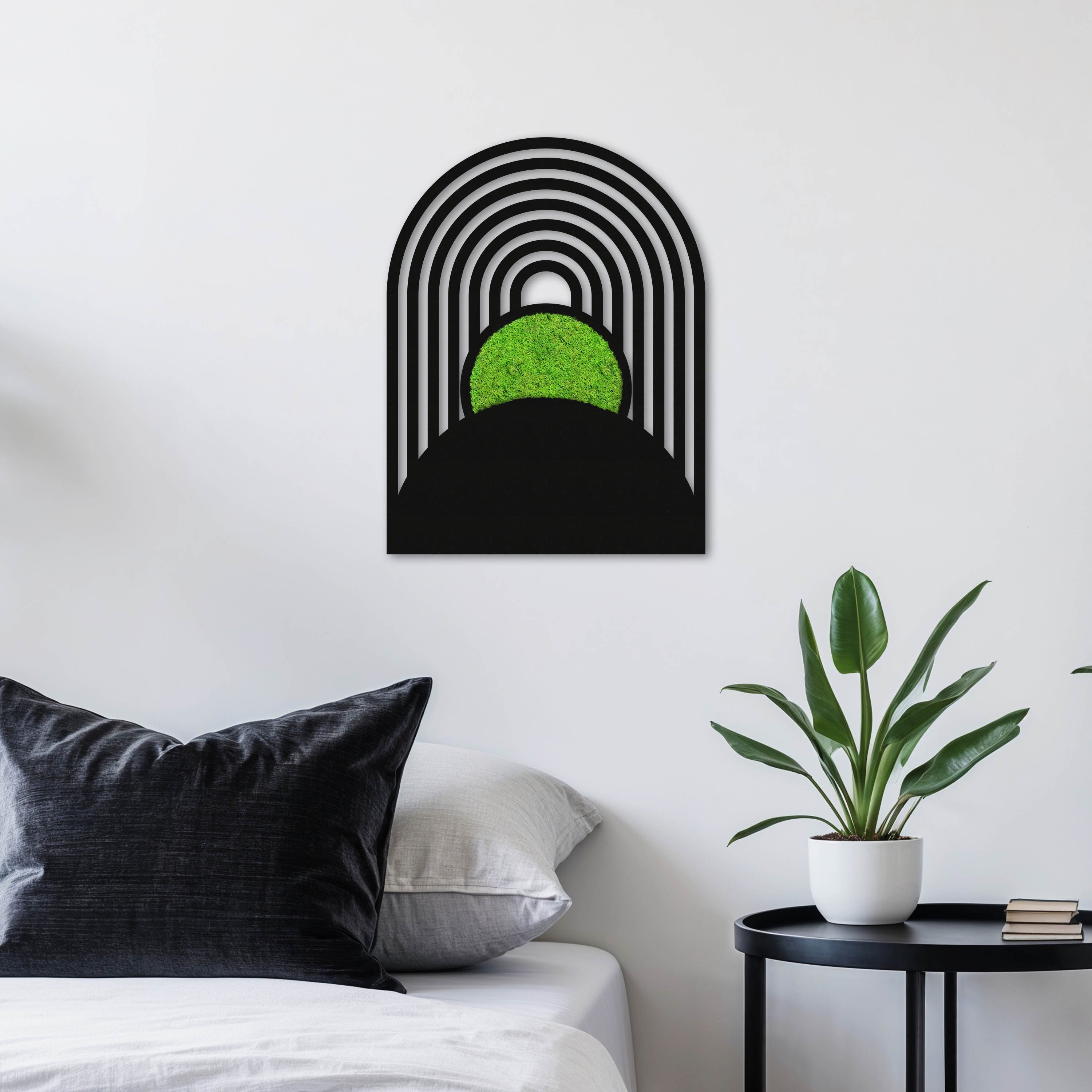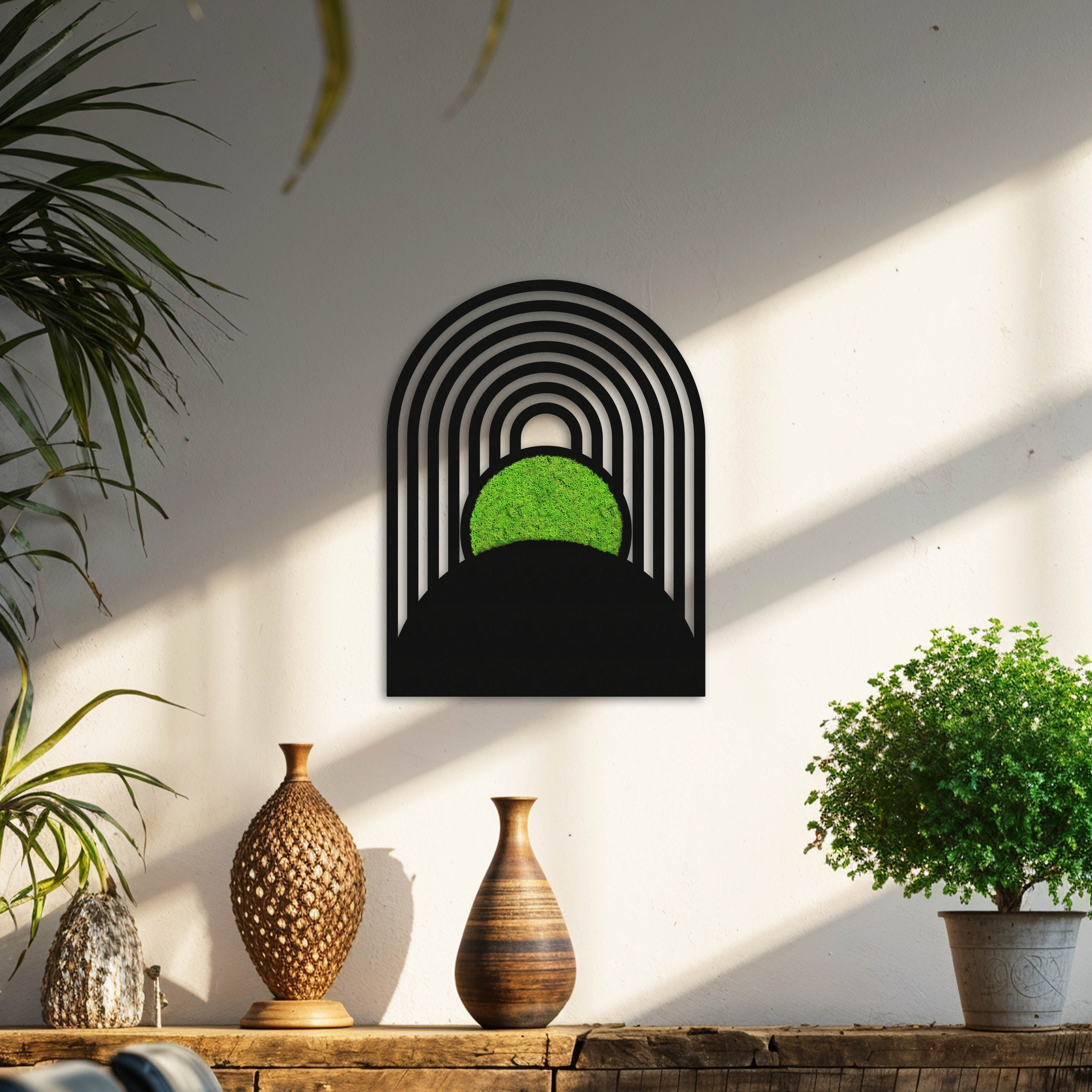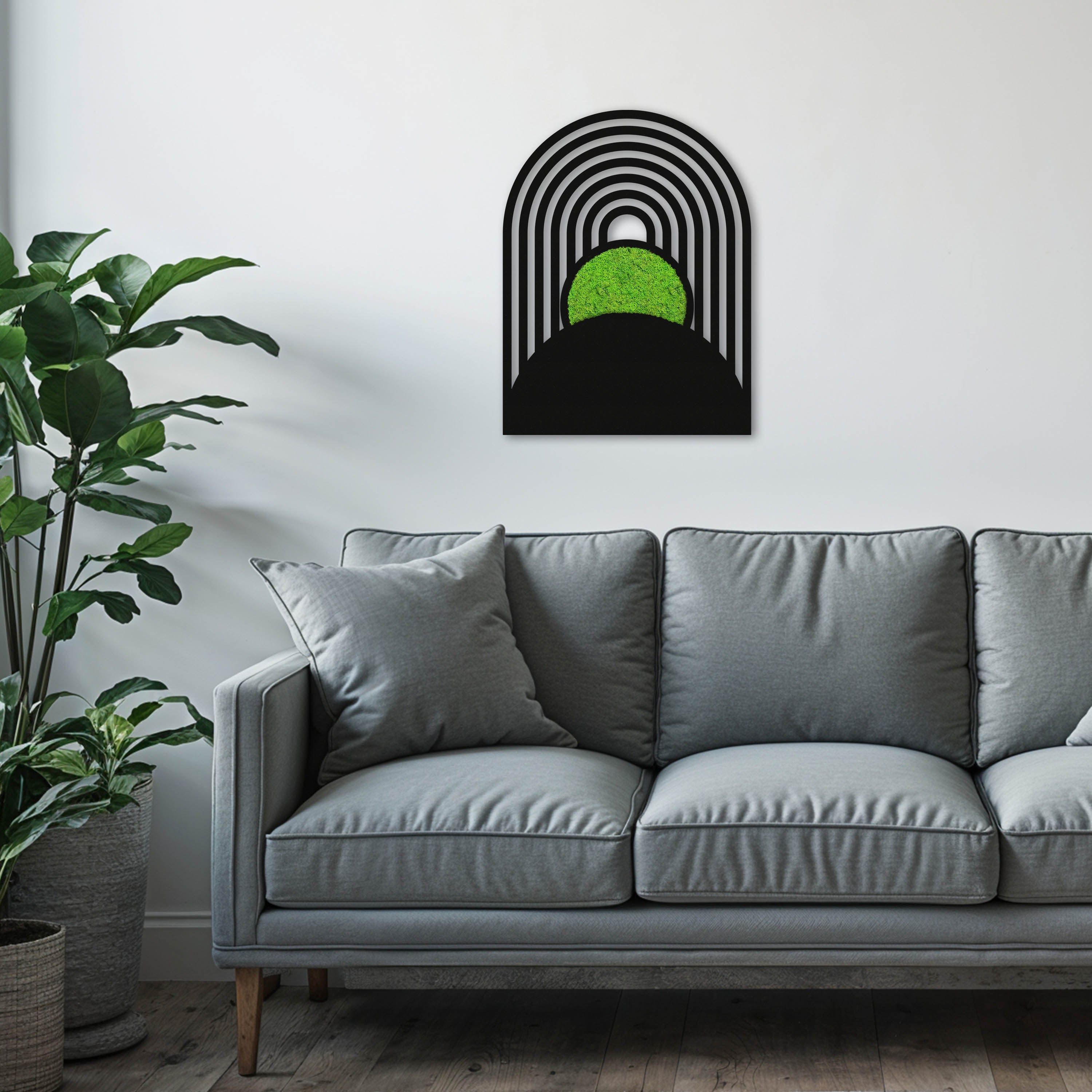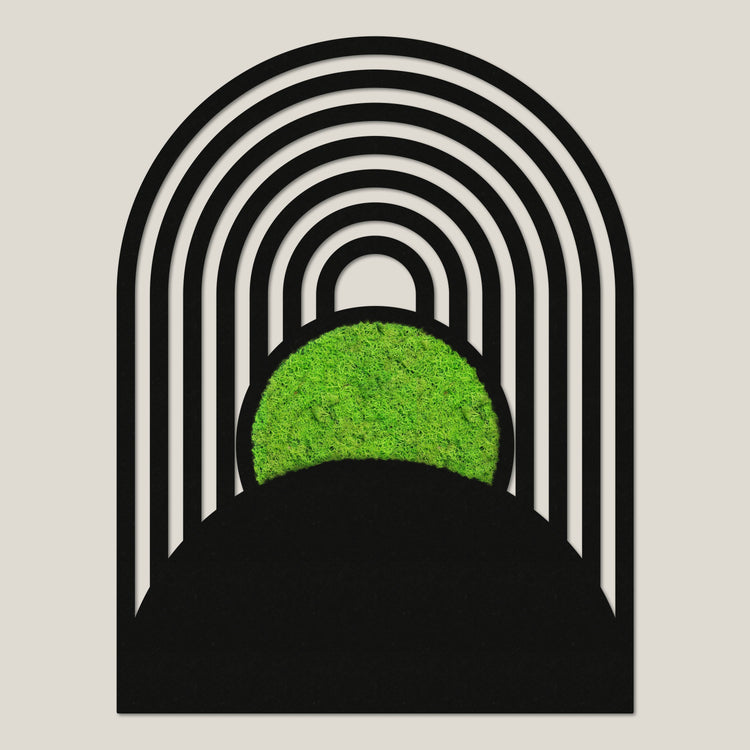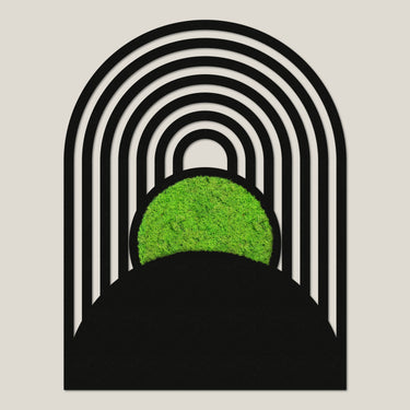 Das Moosbild Botanische Kreisbögen verbindet klare geometrische Formen mit lebendigem, konserviertem Moos – und bringt so Natur und Design stilvoll in Einklang. Die sanft geschwungenen Bögen treffen auf eine strahlend grüne Mooskugel, die wie ein leuchtendes Zentrum im minimalistischen Rahmen wirkt.