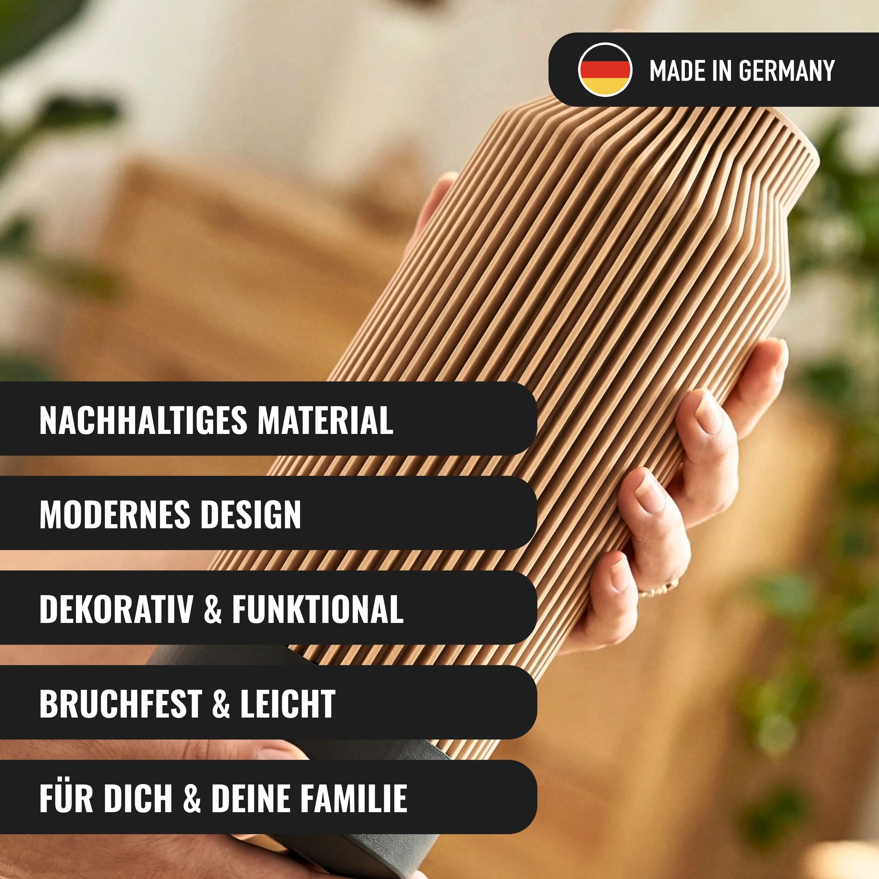 Dank der präzisen 3D-Drucktechnik können wir filigrane Formen, klare Linien und individuelle Strukturen umsetzen – ideal für stilvolle Dekoration mit Charakter. Für den täglichen Gebrauch sind unsere Vasen zusätzlich mit einem wasserdichten Einsatz aus Polypropylen ausgestattet, der frische Blumen und Wasser problemlos aufnimmt.