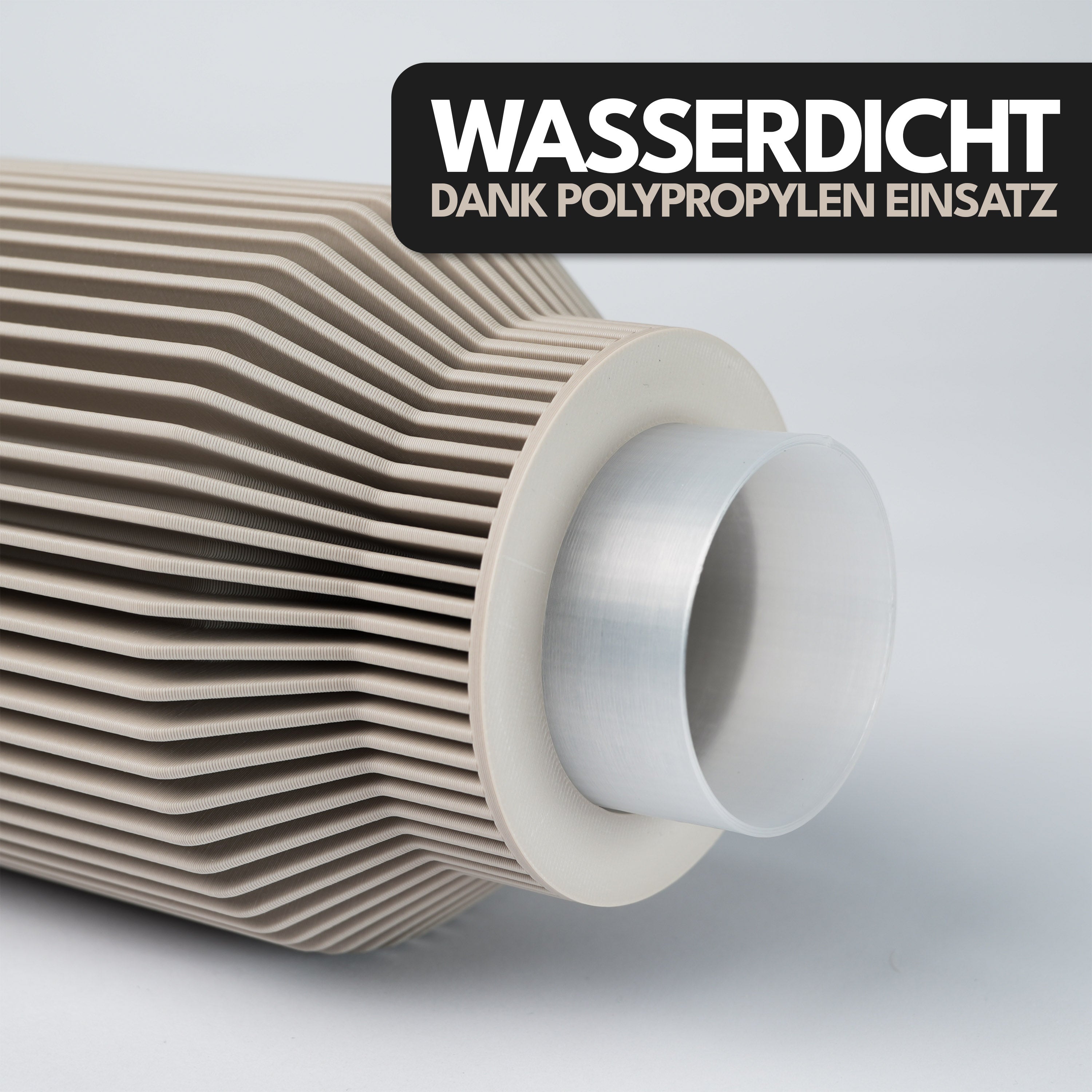 Für Anwendungen, bei denen Wasserdichtigkeit und besondere Widerstandsfähigkeit gefragt sind, setzen wir auf Polypropylen (PP). Dieses Material überzeugt durch seine hohe Beständigkeit gegenüber Feuchtigkeit, Chemikalien und mechanischer Belastung. Polypropylen ist äußerst robust und flexibel zugleich, wodurch es sich perfekt für funktionale Vasen eignet, die regelmäßig mit Wasser in Kontakt kommen, ohne dabei an Form oder Stabilität zu verlieren.